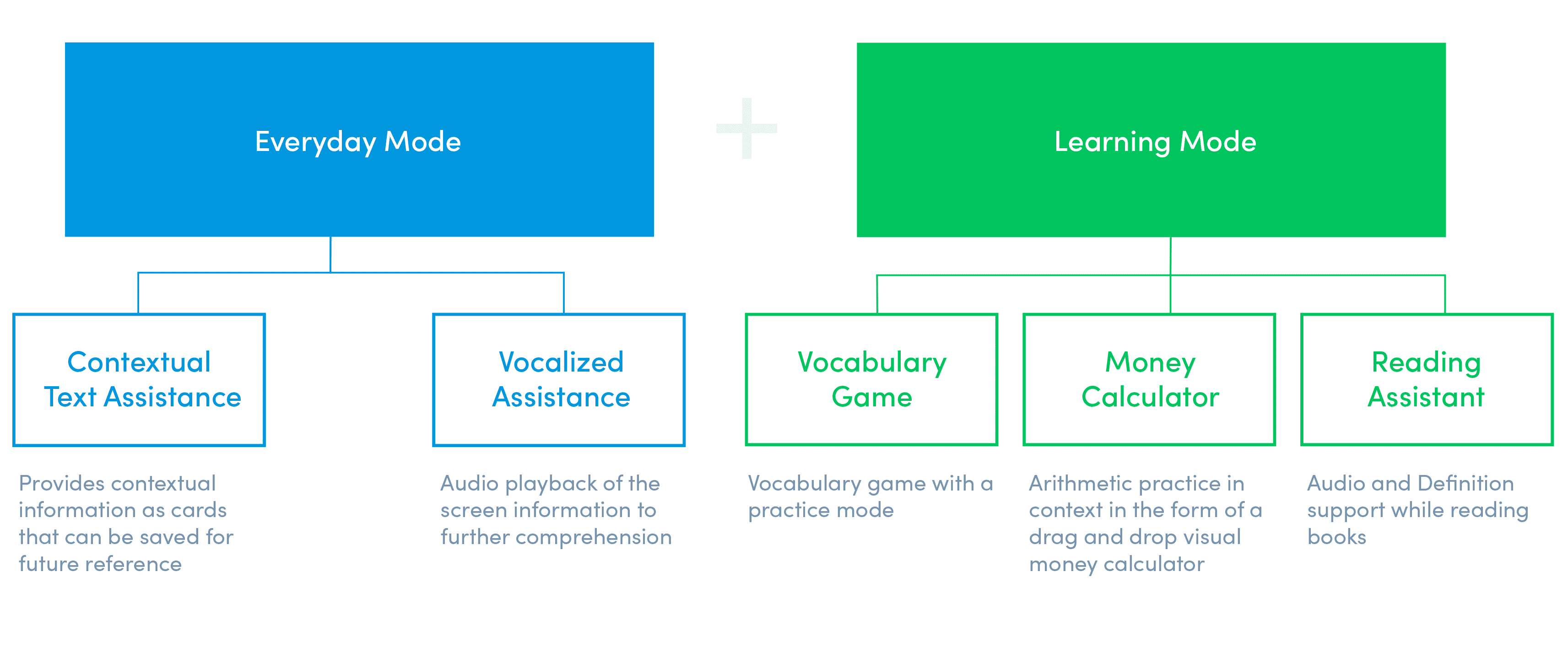Users can scan any object in their surroundings to get more information about it. It also tries to replace difficult words into words within their reading range to allow for better comprehension. An added audio read-out option reads the words slowly to further support this.